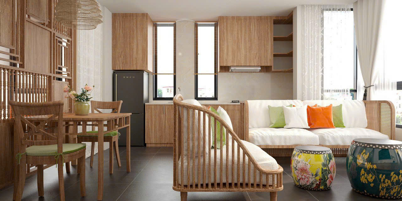 Sofa gỗ tự nhiên hoặc mây tre đan, kết hợp nệm vải bố cao cấp.