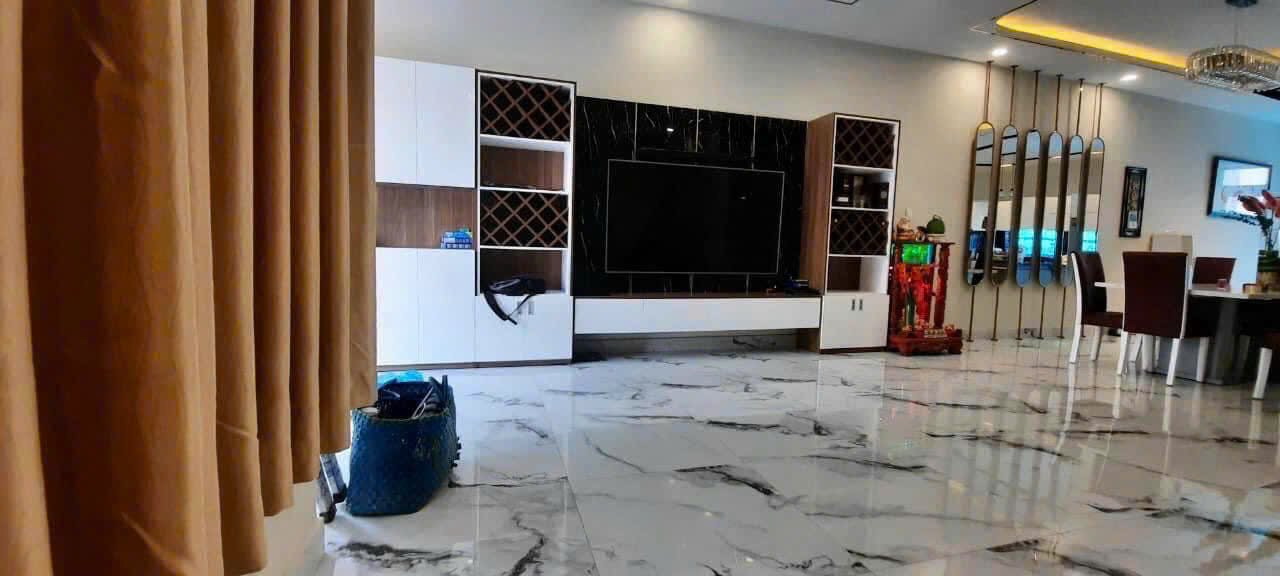 Sàn nhà được lát đá granite nhập khẩu vân mây, tạo cảm giác mát mẻ và dễ vệ sinh. Bộ sofa bọc nhung cao cấp màu xanh xám, bàn trà mặt đá trắng vân rạn và đèn chùm pha lê tạo nên không gian tiếp khách sang trọng, ấm áp.